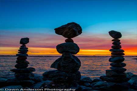Rocks are balanced by Rabindra Sarkar. Come and see him at SeaPort Village, San Diego, California. He'll share the secret of putting heavy stones on the top of each other in unbelievable balance. All you need to find is a "landing spot" on the bottom stone, imaginary vertical line that goes through both rocks, and place them together. Gravity and your concentration will do the rest. "You need to feel the energy of the stone, feel the wind as it moves around its edges, then disconnect from anything that bothers you and seek that perfect balance... It brings peace to the mind" he said.